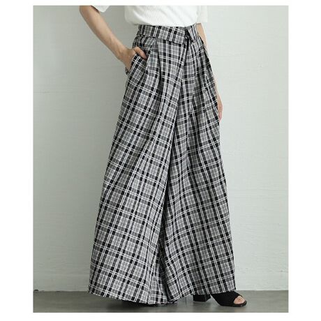 【パンツ】 チェック フレア ワイド ロング ウエストゴム ジッパーフライ ポケット ブラック 夏