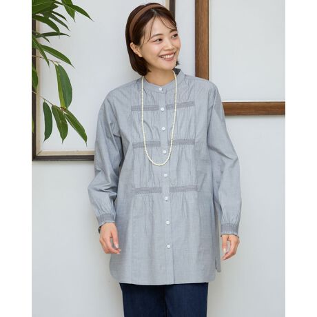 オーガニックコットン100%のシャツチュニックです。前身左右に3本づつと袖口にシャーリング刺繍を入れています。襟は低めのスタンドカラーです。一枚着でも羽織としても着用頂けます。色は2色展開で黒×白とネイビー×白のシャンブレーになります。