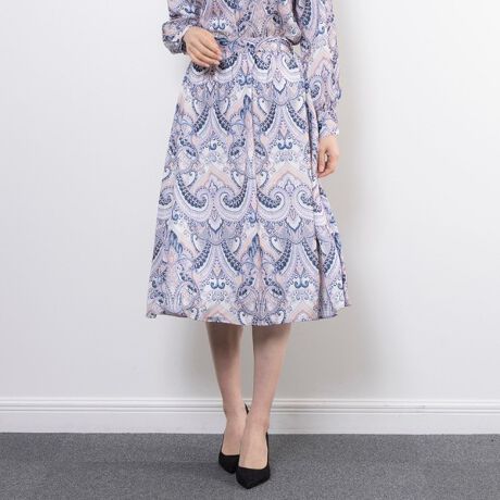 クラシカルでインパクトのあるプリントを、落ち感のある素材で生かしたソフトボリュームスカート。背面のウエストはゴム仕様になっているので、フィット感のある着心地を実現します。着るだけで秋らしさを演出できる単品使いはもちろん、同じ柄のブラウス(30-52-01-928、30-52-01-929)を合わせるワンピース風の着こなしで、甘すぎない大人のフェミニンスタイルもおすすめです。