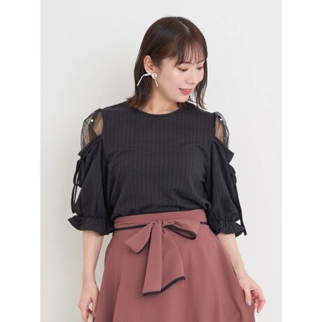 チュール仕様の肩開きデザインに華やかなパールをあしらった大人の華やぎトップス