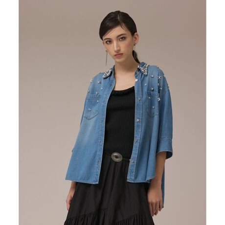デニムシャツを女性らしくアップデートした主役級デニムハーフスリーブシャツ。柔らかくしなやかで落ち感のあるデニムを使用した、軽い着心地の一枚。バランス良く散りばめられたパール&ビジューで華やかに仕上げ、カジュアルになりがちなデニムアイテムをラグジュアリーに昇華した拘りのデザインです。 前後で着丈差を設けたゆったりとしたサイズ感に、サイドスリットを入れて動きを持たせたシルエット。色落ちを再現したヴィンテージカラーと今の気分をたっぷりなデザインが調和した、晩夏から初秋にかけてさっと羽織りやすい拘りが詰まったデニムシャツです。