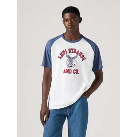 ゆったりとしたリラックスシルエットのTシャツ。バイカラーのボディにグラフィックロゴがプリントされたデザインです。流行りのリンスカラーのジーンズやワークパンツと合わせていただきたい一枚です。