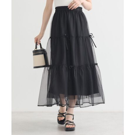 チュール生地を2枚重ねたボリュームのある仕立てが魅力的なスカート。ティアードギャザーの切り替えに加え、ランダムに配したリボンアクセントが甘さのあるアクセントです。ウエストシャーリングゴムでニュアンスあるタックインも楽しめ、着脱がしやすいのも嬉しいポイント。ワントーンながらも存在感たっぷりに演出してくれるおすすめのアイテムです。透け感[ややあり]