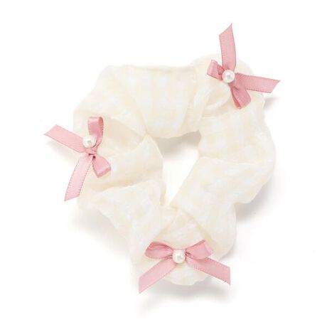 オフホワイト系・ピンク系:透け感のあるチェック生地にポンポンと並んだリボン+パール風ビーズがフェミニン