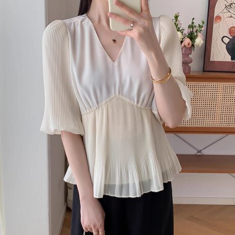 フレアなシルエットでややボリューム感がありながら、Vネックでスッキリ綺麗めに仕上げました。