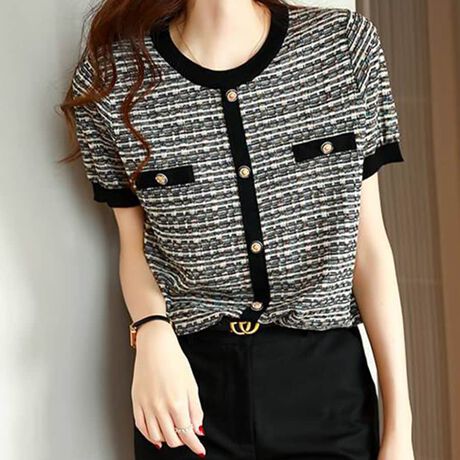 女性らしさを演出するツイード風デザインがチャームポイントの春夏のおすすめエレガントブラウスが新登場♪