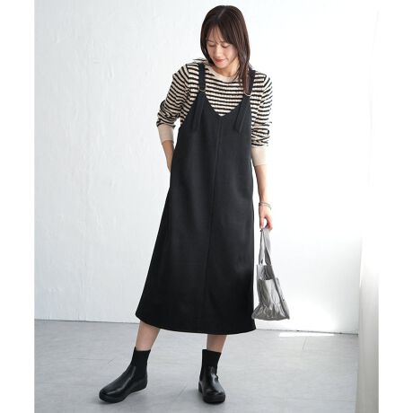 太めの肩紐にバックル付きのデザインで、どちらを前にしても着用可能なジャンパースカート。