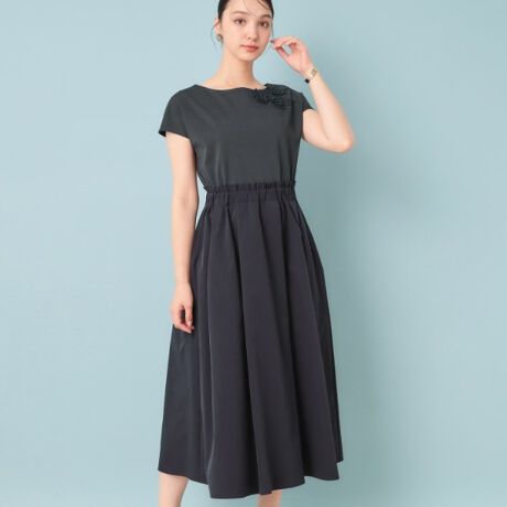 一枚で簡単に決まるカットソーと布帛の異素材切替えワンピース。