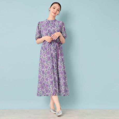 衿元から裾に施したプリーツのなびきが美しいスタンドカラーワンピース。