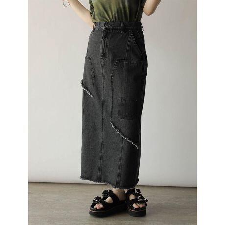 パッチワーク風の切り替えや、アシメに施したフリンジデザインが遊び心をプラスするデニムスカート。