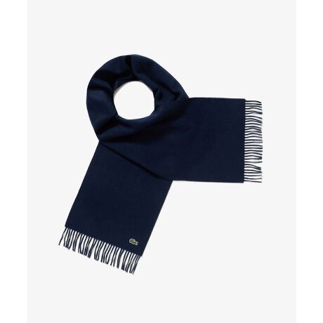 [型番:RE036J-99]シンプルなデザインにエレガントな素材感が際立つメリノウールスクールマフラー・やわらかさと保温性に優れたオーストラリア産メリノウール素材・幅広いスタイリングに対応するシンプルなスクールマフラーデザイン・動きのあるアクセントをプラスする先端フリンジ・ワニロゴパッチをワンポイントで配置・180cm×30cm