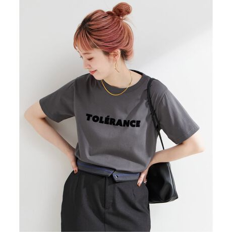表面感が特徴的なフロッキープリントのミニマムなロゴが大人に着られるTシャツ。やや短めの丈感でコンパクトにしていて、キャミワンピースなどとレイヤードでロゴが見えるような配置にしています。