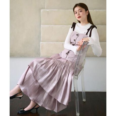 縦筋が入っているシャイニーな割線素材を使用したティアードスカート。アシンメトリーなティアードデザインです。フリルの切替位置に入れた、さり気ないシャーリングがポイント。落ち感があるので腰まわりのボリュームを抑えながら、縦長シルエットを演出します。Tシャツ×ジャケット合わせがおすすめです。※撮影時照明の関係により、色味が違って見える場合がございます。またパソコン・スマートフォンなどの環境により、若干製品と画像のカラーが異なる場合もございます。予めご了承ください。商品の色味は、商品単品画像をご参照下さい。※商品画像はサンプルのため、色味やサイズ等の仕様に変更がある場合がございますので、予めご了承ください。