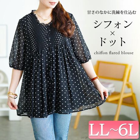 【大きいサイズ】 ドット柄プリーツシフォンフレアブラウス 大きいサイズ レディース トップス 五分袖