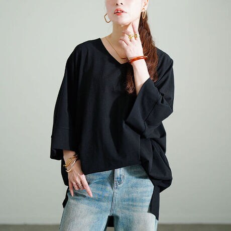 ラフなシルエットでこなれ見え!Vネックコットンドルマンチュニックの登場です☆ゆったりとしたシルエットでボディラインを拾わず体型カバー力も抜群です◎デコルテがきれいに見えるVネックでお顔まわりスッキリ☆二の腕をカバーする人気のドルマンスリーブでリラクシーな着心地◎抜け感のあるサイドスリット仕様で前だけインのスタイリングもかっこよくキマります!デイリーカジュアル〜オフィスカジュアルまで様々なシーンで活躍間違いなしの一着です♪