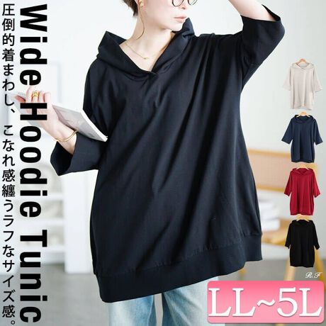 ぽっちゃりさんに大人気のワイドシルエットでラフな着心地☆ストレッチコットンチュニックパーカーの登場です!唯一無二のゆったりシルエットが落ち感を作りだし洒落感を演出します☆ヒップラインが隠れる長め着丈で、細身のボトムスも視線を気にせずご着用いただけます◎やや大きめのフード&V開きデザインの首元でお顔まわりをスッキリ見せしてくれます♪