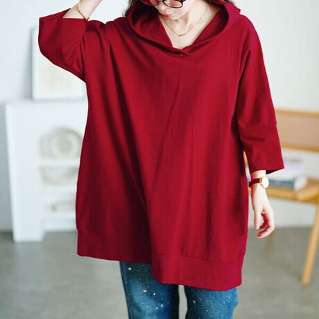 ぽっちゃりさんに大人気のワイドシルエットでラフな着心地☆ストレッチコットンチュニックパーカーの登場です!唯一無二のゆったりシルエットが落ち感を作りだし洒落感を演出します☆ヒップラインが隠れる長め着丈で、細身のボトムスも視線を気にせずご着用いただけます◎やや大きめのフード&V開きデザインの首元でお顔まわりをスッキリ見せしてくれます♪