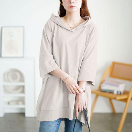 ぽっちゃりさんに大人気のワイドシルエットでラフな着心地☆ストレッチコットンチュニックパーカーの登場です!唯一無二のゆったりシルエットが落ち感を作りだし洒落感を演出します☆ヒップラインが隠れる長め着丈で、細身のボトムスも視線を気にせずご着用いただけます◎やや大きめのフード&V開きデザインの首元でお顔まわりをスッキリ見せしてくれます♪