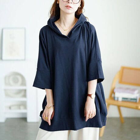 ぽっちゃりさんに大人気のワイドシルエットでラフな着心地☆ストレッチコットンチュニックパーカーの登場です!唯一無二のゆったりシルエットが落ち感を作りだし洒落感を演出します☆ヒップラインが隠れる長め着丈で、細身のボトムスも視線を気にせずご着用いただけます◎やや大きめのフード&V開きデザインの首元でお顔まわりをスッキリ見せしてくれます♪