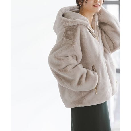 艶やかなエコファー素材のフード付きブルゾン。