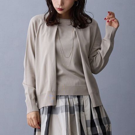 レイヤードしたようなデザインは、着方によってカーディガンを肩から羽織ったような仕様にもできます。簡単にこなれて見え、人と差のつくデザインアイテムです。
