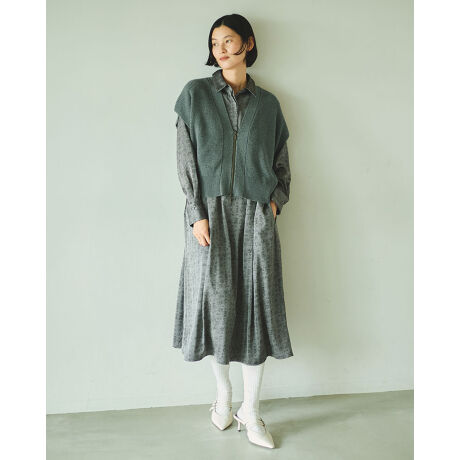シャツカラーで比翼開き、ウエストからタックをつけて広がり過ぎずスッキリしたシルエットにしています。ウエストリボンは取り外し可能です。