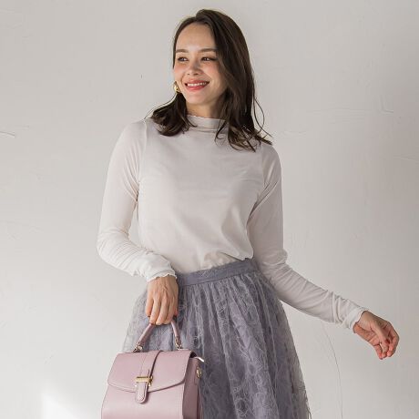 クラシカルなボトルネックと袖口の指ぬきデザインがポイントに。
