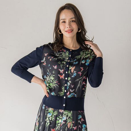 ブラウスライクに装えるプリントドッキングのカーディガン。