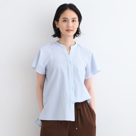 涼しげでお洒落な表面感が特徴のカラミ素材を使用したフレアースリーブブラウスです。
