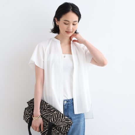 涼しげでお洒落な表面感が特徴のカラミ素材を使用したフレアースリーブブラウスです。