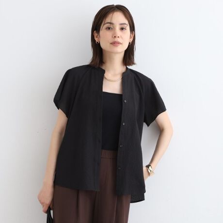 涼しげでお洒落な表面感が特徴のカラミ素材を使用したフレアースリーブブラウスです。