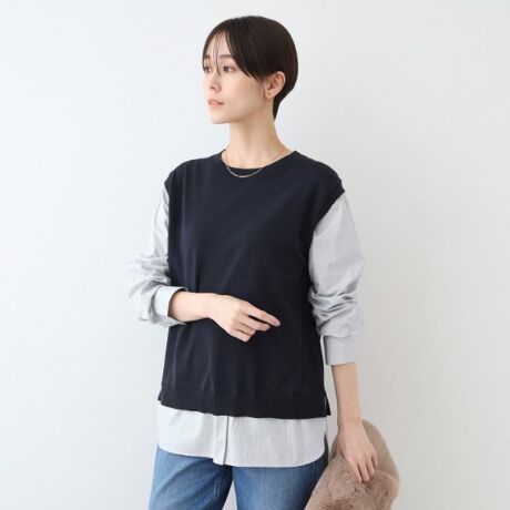 ベスト部分はハイゲージの綺麗目のニットなのでカジュアルはもちろん、オフィススタイルにもご活躍頂けるアイテムです。