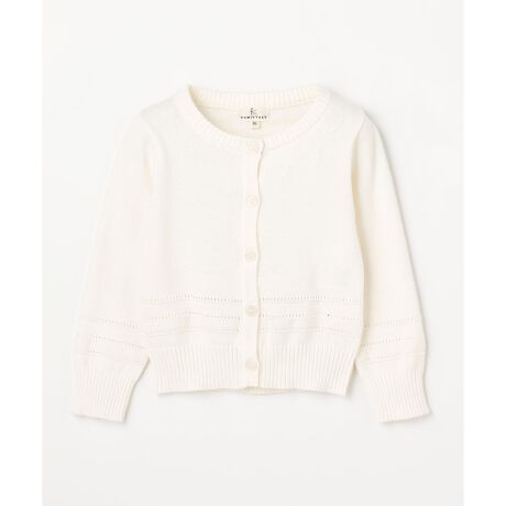 ■デザイン定番のカーディガンをアップデート。左胸にさりげなく施されたカノコ編みのリボンモチーフがアクセントになった、上品で甘すぎないデザインに仕上げました。ウエスト部分にもリボンモチーフとリンクさせた透かし編みのラインを施しております。ボタンを閉じてトップス風にも、羽織りとしても着用可能で、1枚でコーディネートの幅が広がります。