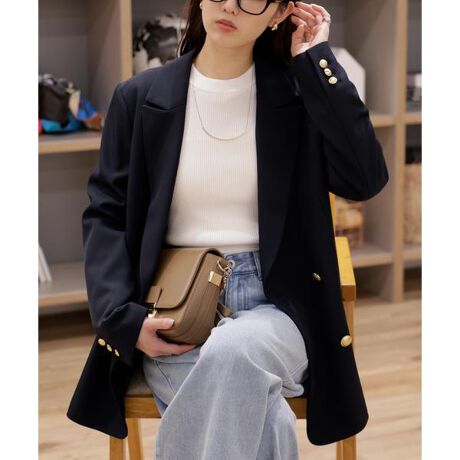 マニッシュな雰囲気のジャケット。スタンダードなダブルブレストで、肩まわりや身頃がすっきり見えるよう拘ったシルエットです。少し大きめなカラー(襟)もポイント。後ろはベンツスリット入りで動きやすく羽織り心地も良いです。※モデルの着用画像の場合、光の当たり具合により、実際の色味と異なって見えることがございます。色味は、商品単体の画像をご参照ください。