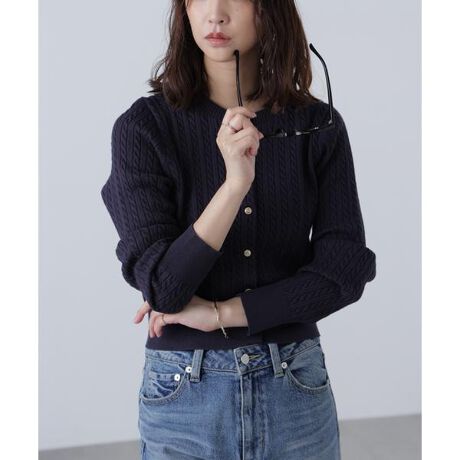プレッピーな雰囲気のミニケーブルカーディガン。程よいコンパクトなシルエットで、目の詰まったミニケーブル×リブの編地で凸凹があり、体のラインを拾わずスッキリと着こなせます。小ぶりでマットなゴールドカラーのボタンがポイント。シャツカラーやフリルネックブラウスとのレイヤード見せや、フロントのボタンを全て留めて、プルオーバーのようにも着られます。デニムやミニ丈のボトムスとのコーディネートがおすすめです。※モデルの着用画像の場合、光の当たり具合により、実際の色味と異なって見えることがございます。色味は、商品単体の画像をご参照ください。