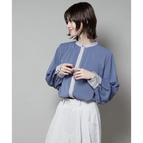 上品な配色のバイカラーデザインが目を引く着映えブラウス。衿元に入ったギャザーやスタンドカラーのデザインが、甘すぎずシャープな印象に。柔らかく、落ち感のある素材できちんと感のある着こなしが叶います。