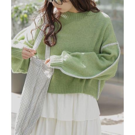 毎年好評の杢ストレッチ総針配色ステッチニットが今年も登場!もちっとした膨らみのある糸のニットプルオーバーです。ゆるっとドロップショルダー部分から袖と裾まわりに配色ステッチを施し、デザインポイントになっています。ワイドめのシルエットながらもクロップド丈でバランスがとりやすいです。杢ベージュ・グリーンは昨年と同色、杢グレー・杢パープル・ブルーは今年の新色です。クロップド丈なのでパンツでもスカートでも合わせやすいです。※モデルの着用画像の場合、光の当たり具合により、実際の色味と異なって見えることがございます。色味は、商品単体の画像をご参照ください。