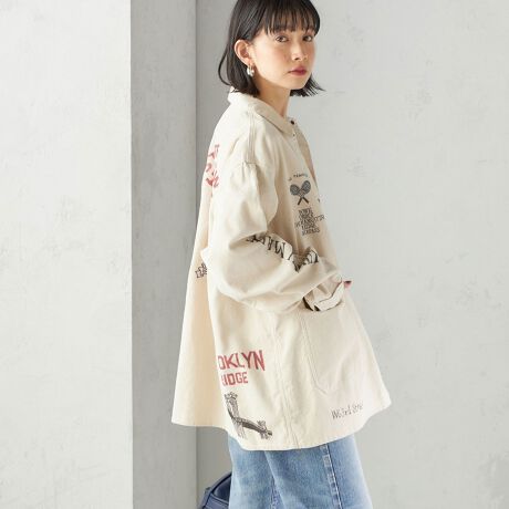 WHITE FIELDの過去の広告をアレンジしたデザインをプリントし、メモリアルジャケット風に仕上げたカバーオールはシンプルな装いのプラス1点にピッタリ。