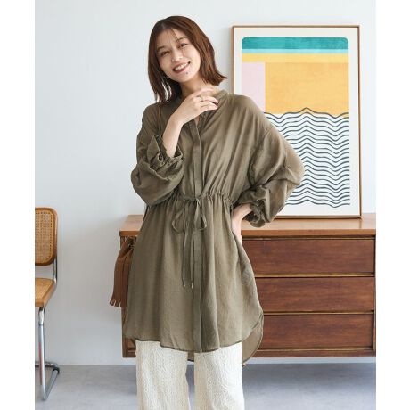 秋 チュニック バンドカラー シアー ボリューム袖 ウエストマーク ドロスト 比翼シャツ 体型カバー 着痩せ 羽織り ロングシーズ 25AW