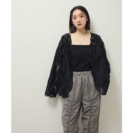 フラワーモチーフを編み込んだレース素材がフェミニンなカーディガン。スカラップ仕様の裾が一層華やかさを演出して、さらりと着るだけで印象的なスタイリングが完成します。透け感を生かして色物インナーとのコントラストを楽しむのもおすすめ。秋を感じるシックなカラーリングにも注目です。透け感[ややあり]