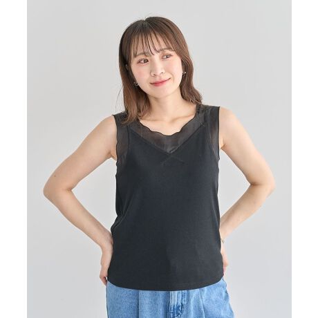 ナチュラルなリブタンクトップにシアー生地を切替ジョイントしたこなれ感ある一枚。ほんのり透け感を魅せるヘルシーなデザインがアクセント使いに最適な仕立てです。羽織りアイテムとあわせたラフなスタイリングやレイヤードにも好相性。ワントーンの着回しやすいカラーで使い勝手の良いおすすめのアイテムです。透け感[ややあり]