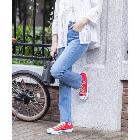 [型番:524303]綺麗なシルエットが魅力のストレートデニムパンツ裾に向かってすっきりと仕上げ、女性らしい脚線美を引き立たせてくれます。撥水加工が施されており、急な雨の日でも着用しやすいのも魅力的なポイント。ストレッチ性のある生地ではきやすく、愛用率も高まりそうなアイテムです。