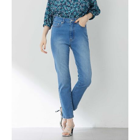 [型番:524303]綺麗なシルエットが魅力のストレートデニムパンツ裾に向かってすっきりと仕上げ、女性らしい脚線美を引き立たせてくれます。撥水加工が施されており、急な雨の日でも着用しやすいのも魅力的なポイント。ストレッチ性のある生地ではきやすく、愛用率も高まりそうなアイテムです。