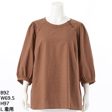 [型番:5705601]薄手の綿麻生地にポリエステルが入っていることで生地の強度が増し、シワにもなりにくく、速乾性が増しています。軽い七分袖ブラウスですが、ダークな2色展開で秋らしいコーディネイトになります。ラグラン線上に付いた釦がポイントです。グリーンノート 大きいサイズ レディース ゆったり シャツ 七分袖 チェック