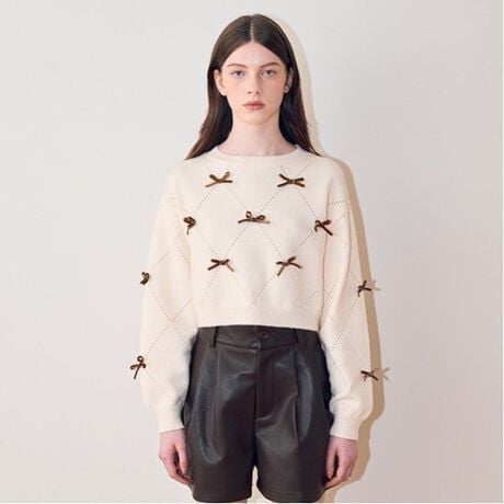 ダイヤ柄の編み地に、散りばめたリボンモチーフが装飾的なニット。付属のベロアリボンの配色もスタイリングのポイントになり、スタイルアップが叶います。
