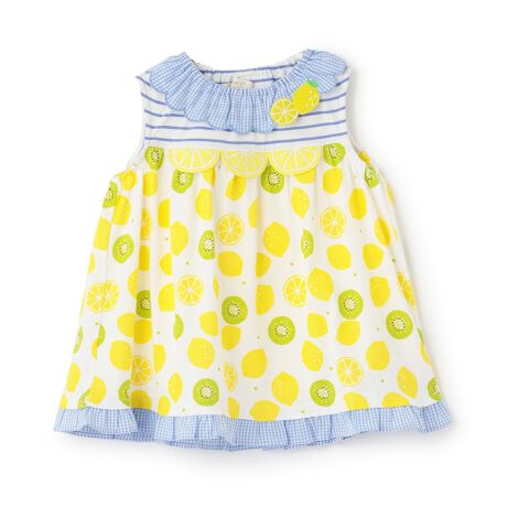 シトラス柄と個性的な生地を組み合わせたチュニックです。衿元のフリルにあしらった、刺しゅうがかわいいポイント。明るくさわやかなスタイリングに仕上がります。衿ぐりは総ゴム仕様なので、お着替えも簡単です。内側にお名前を記入できるタグがついています。