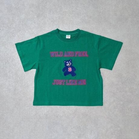 サガラ刺繍で立体感を持たせたくまのワッペンに、ラバープリントのポップなグラフィックをプラス。