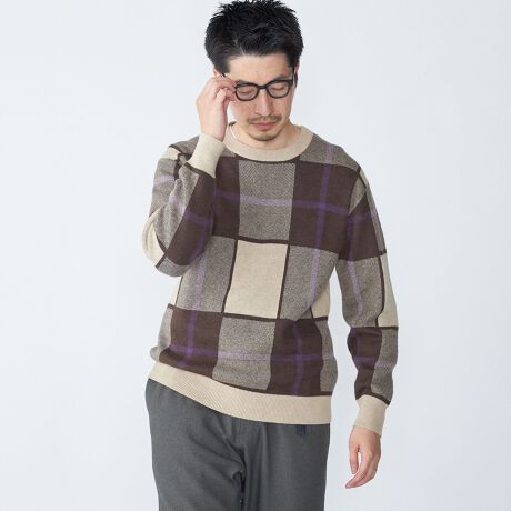 カシミヤブレンドの上品なチェック柄クルーネックニット