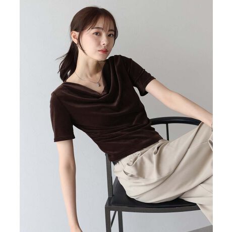 流れるようなドレープ感たっぷりのネックラインが上品なシアーベロアTシャツ。