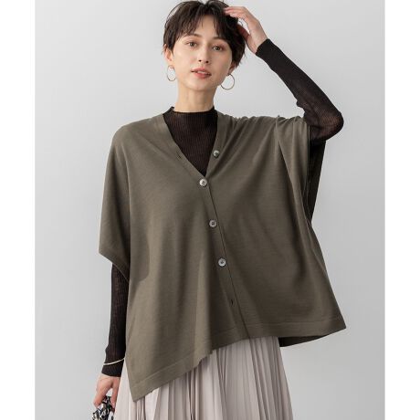 上質な素材感を活かした、ワイドシルエットのニットポンチョ。前後左右斜め、様々な着こなし方で雰囲気を変えられます。脇には隠しボタンが付いているので、ボタンを閉めればきちんと感を演出し、外せば軽やかなドレープシルエットを楽しめます。タンクトップやTシャツの上にはもちろん、シャツやタートルネックとのレイヤードも可能なので、シーズンレスで温度調節に重宝するアイテムです。いつものコーディネートにプラスするだけで、ぐっとおしゃれ度がアップします。カラーは、インナーとのコントラストが楽しいブラック(#005)、ニュアンス感のあるカーキ(#054)、鮮やかで目を引くブルー(#070)の3色展開です。
